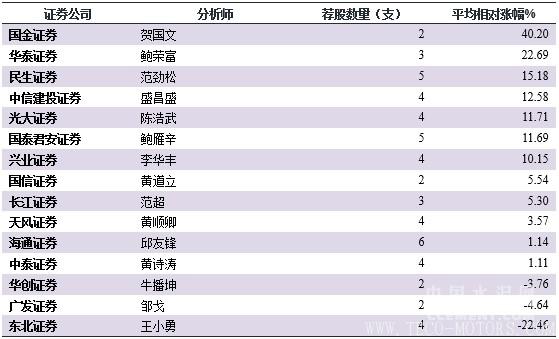 筆者對推薦過2支以上水泥股的分析師進行梳理并就平均相對漲幅作出排名。排名顯示,國金證券的賀國文、民生證券的范勁和民生證券的范勁松位列三甲,而東北證券的王小勇、廣發證券的鄒戈及華創證券的牛播坤平均相對漲幅墊底。